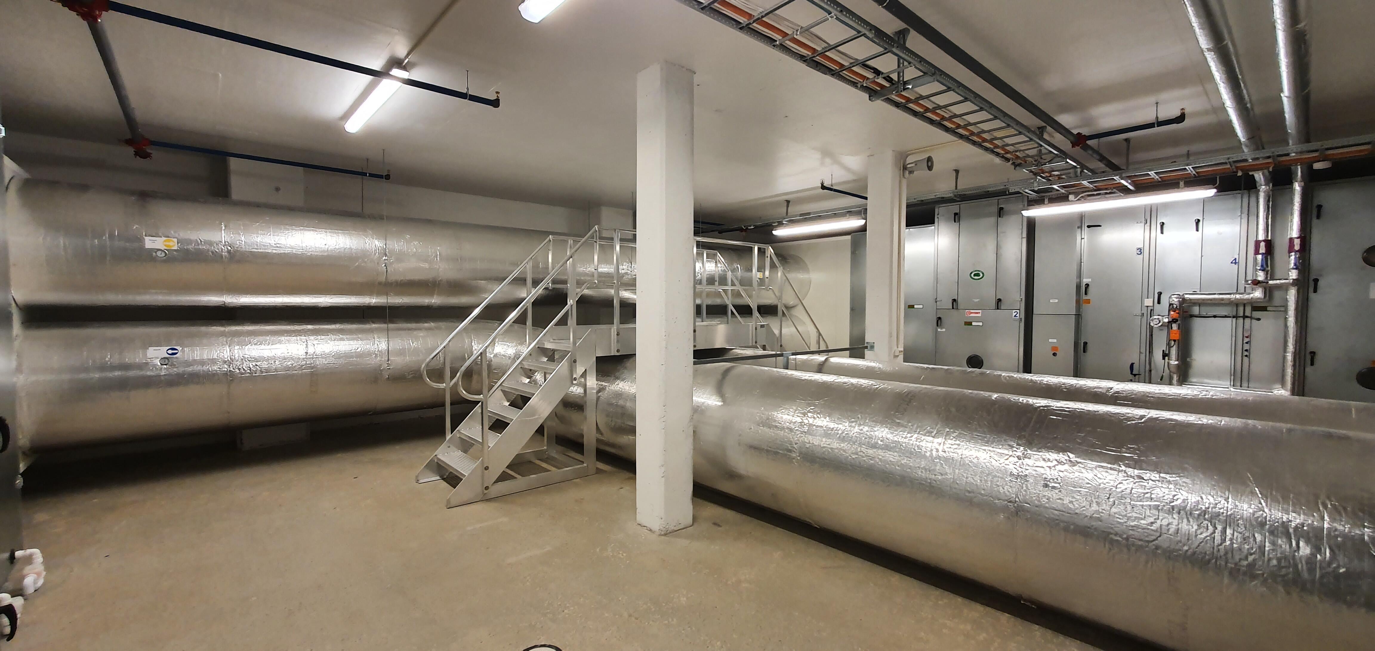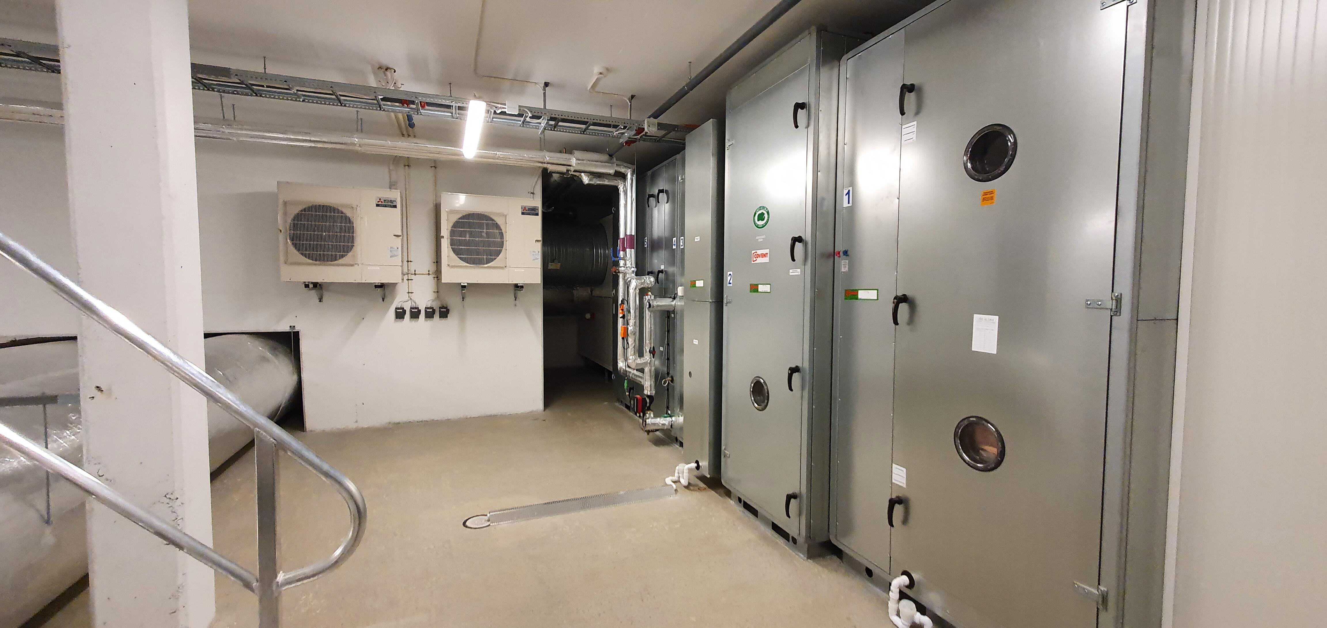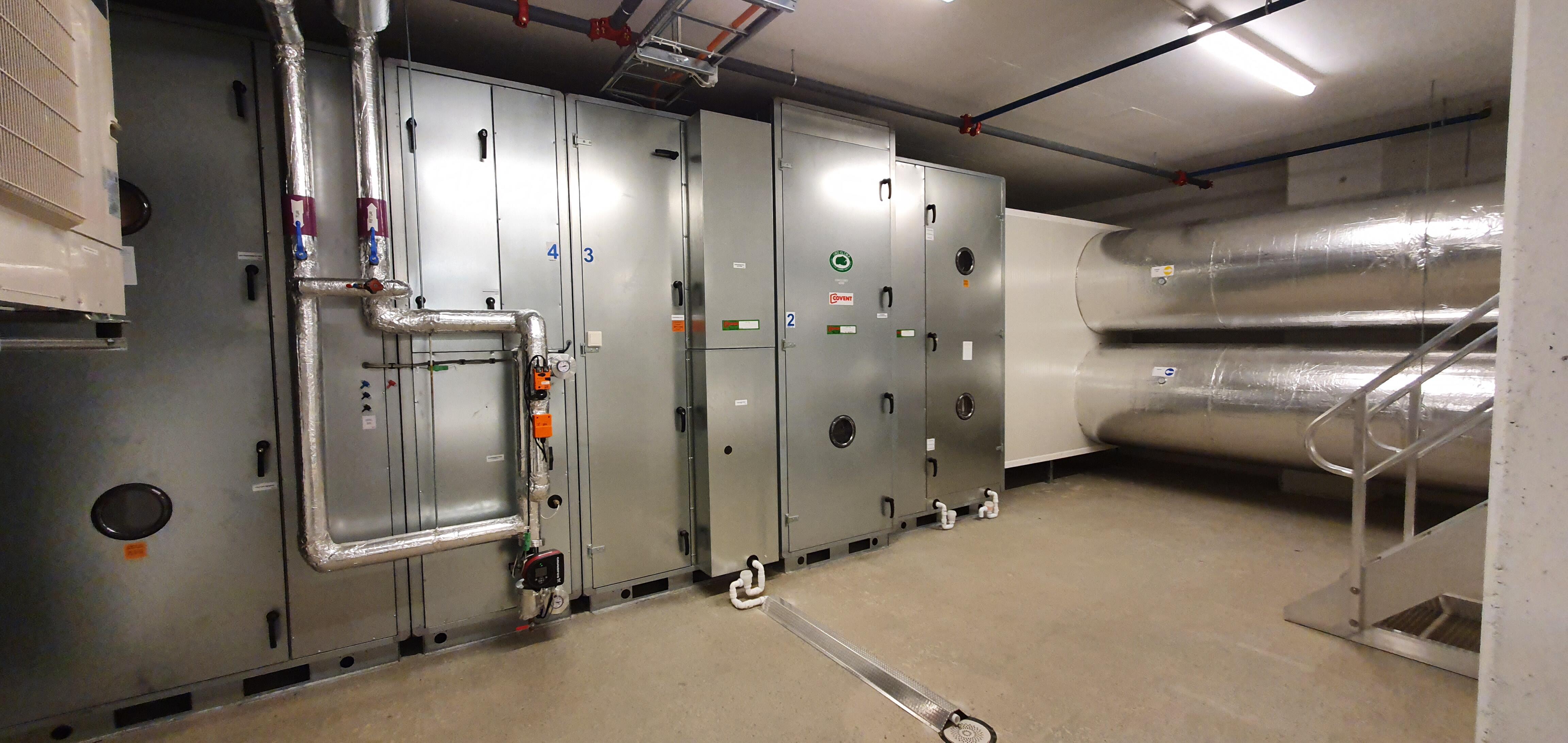 Anlegget består av 4 systemer for ventilering, kjøling og del- oppvarming av lokalene. Anleggene er levert med behovsstyrt ventilasjon. Det er levert aggregater med integrerte kjølemaskiner. Varmesentralen består av en luft/vann varmepumpe som tar hovedoppvarmingen på bygget med distribusjon via 4 stk ventilasjonsaggregater fra Covent. Det er levert et omfattende automatikk og styringssytem for romkontroll, overvåking og drift av alle byggets tekniske funksjoner via Energimesteren AS.